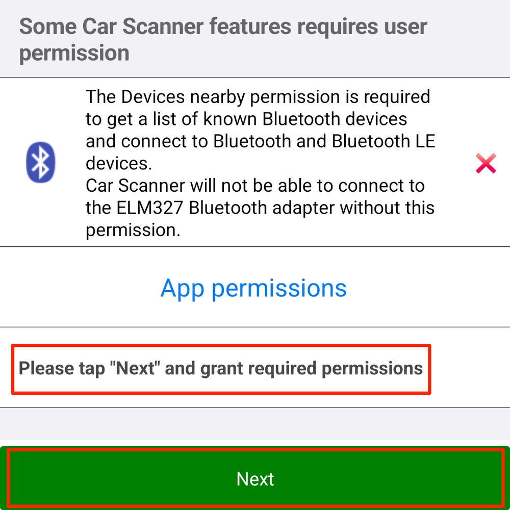 The app will now request Bluetooth permissions. Tap “Next” and then tap “Allow” in the system pop-up that appears. This permission is required for the app to connect to the scanner.