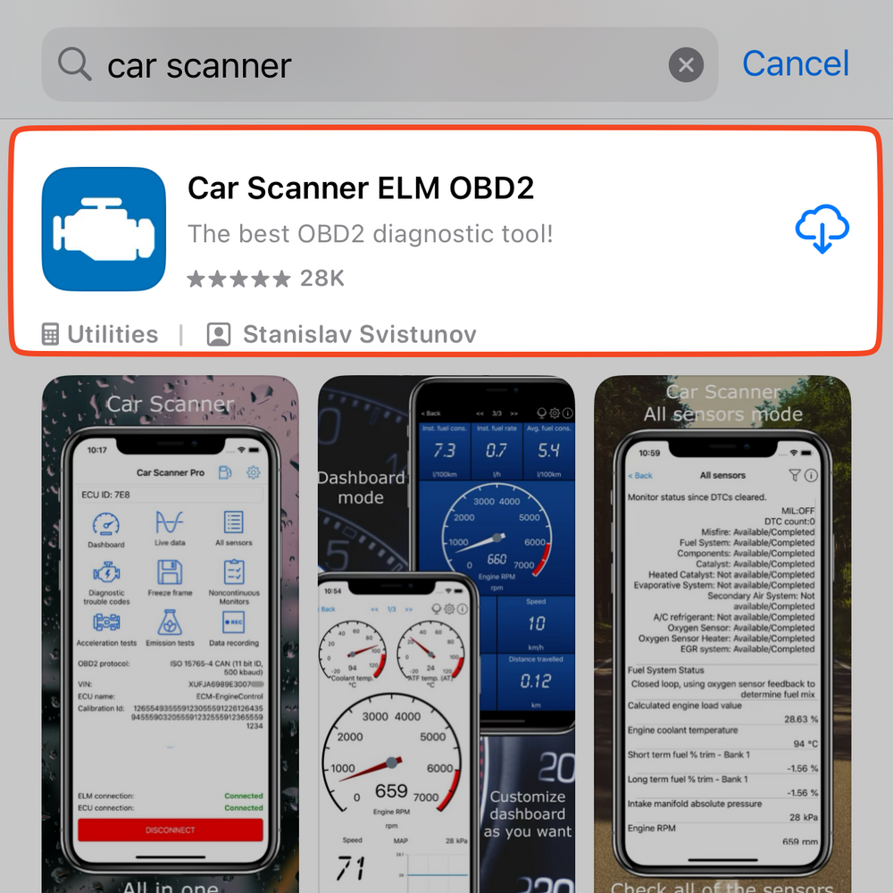 Search for and download the "Car Scanner" App from the App Store. Be sure to get the correct one, “Car Scanner ELM OBD2”, as shown in the app icon, and be aware of advertisements for apps with similar names.