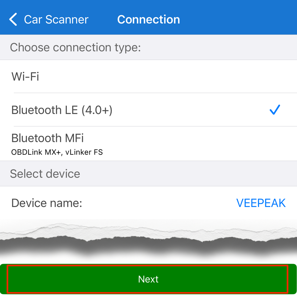 After selecting the "VEEPEAK" Bluetooth device, the app will return to the Connection page. Click "Next". The App will then initiate the connection to the scanner and your vehicle.