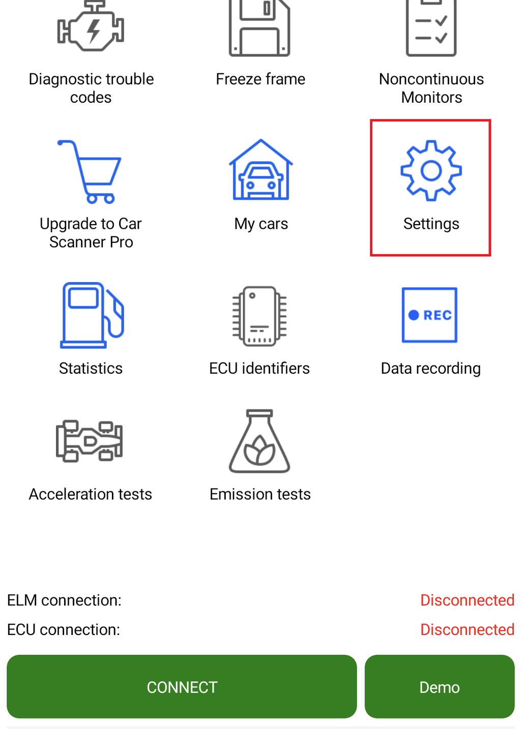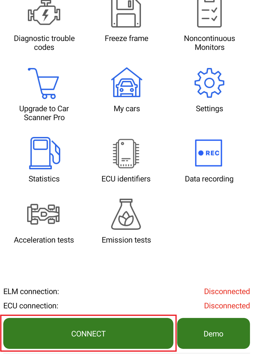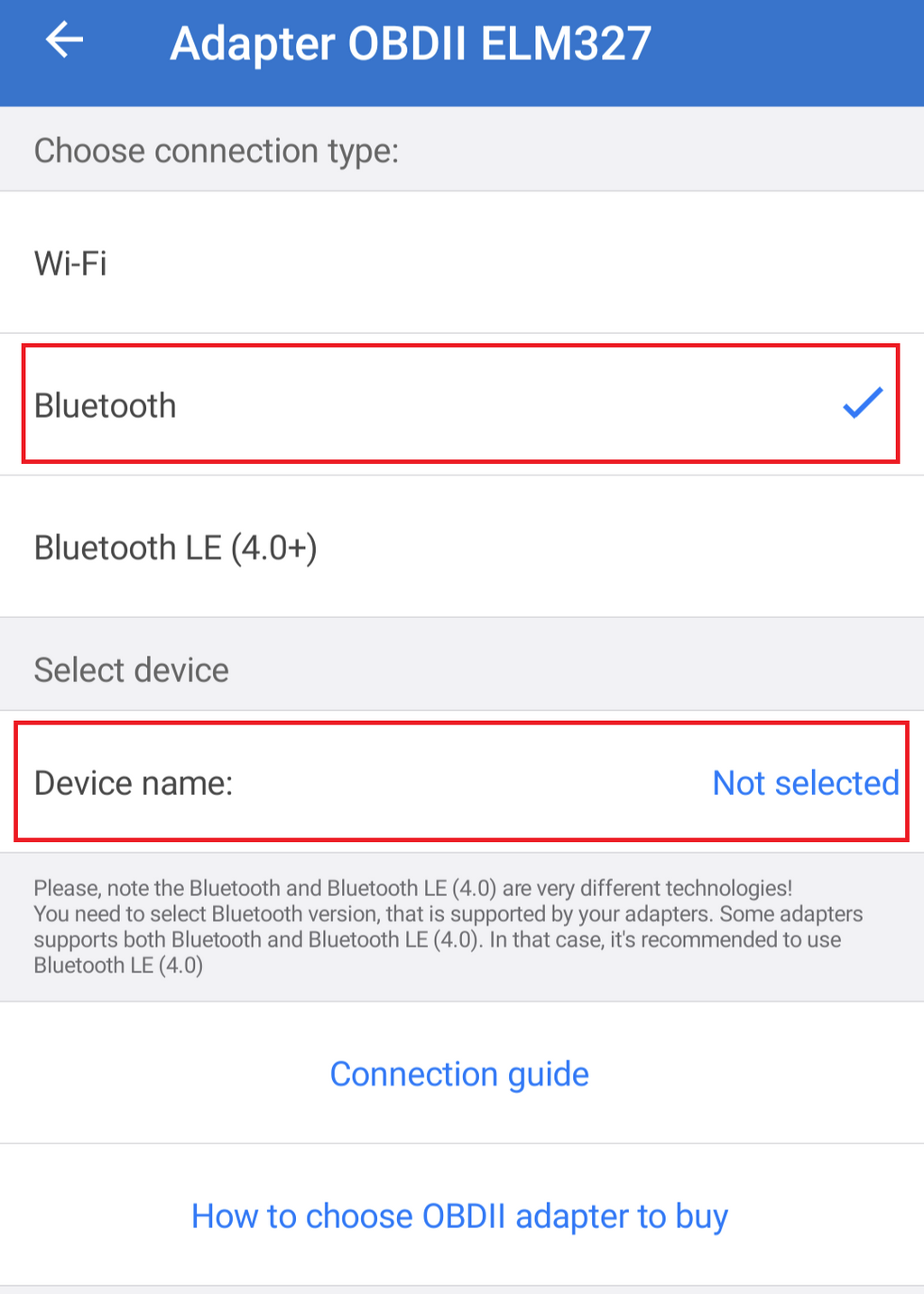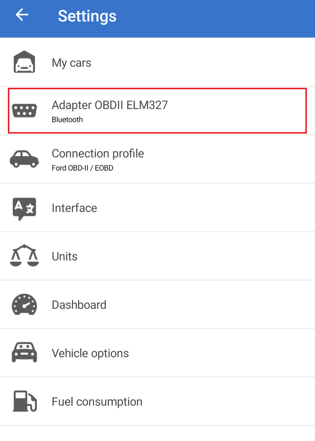 Please go to Settings – Adapter OBDII ELM327, select Bluetooth as connection type, and select “OBDII” as the Bluetooth device. If you have not paired your phone with “OBDII”, you will be asked to enter pin (1234) to pair. Then choose the suitable connection profile for your vehicle, go back to main menu and click “Connect”.