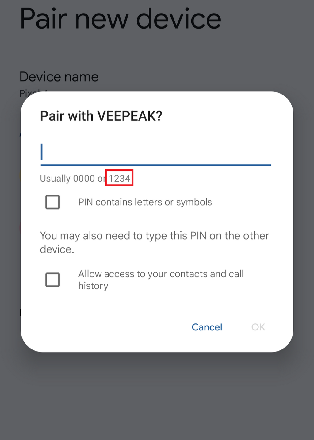 Enable Bluetooth on your phone or tablet, wait for a few seconds until device “OBDII” shows up. Tap it to pair using pin 1234. After pairing, it may show as saved, paired, or previously connected.